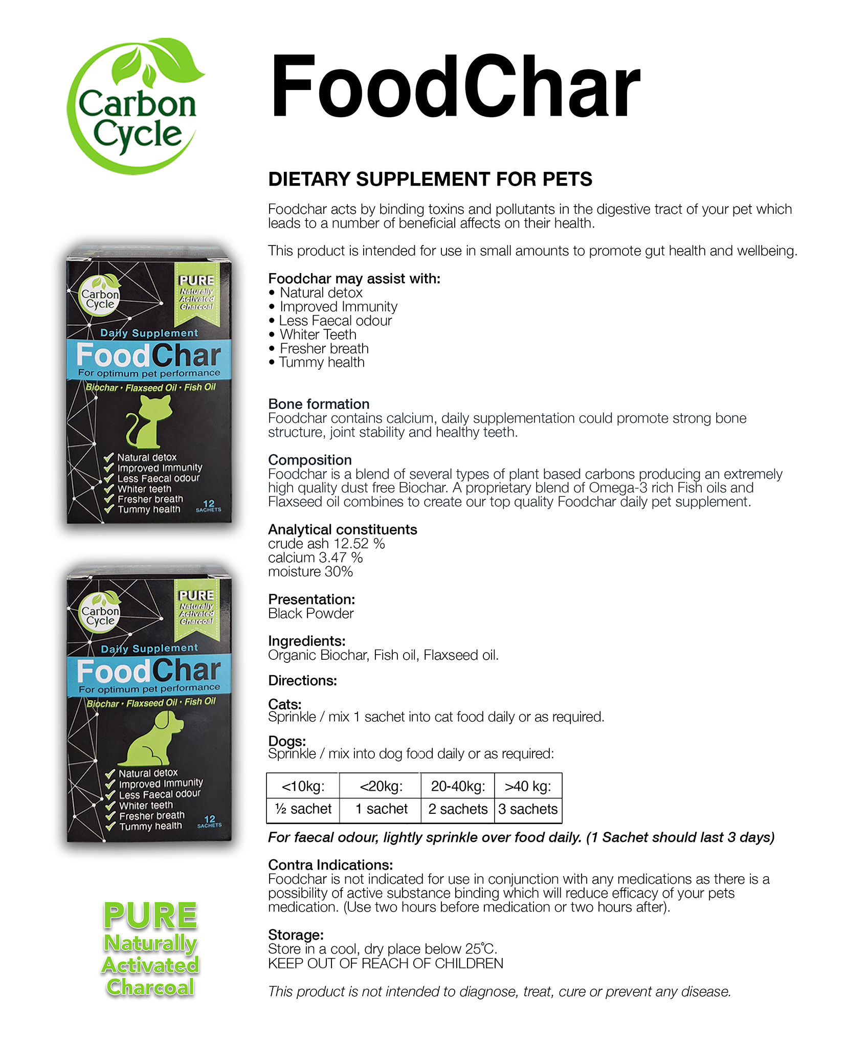 FoodChar acts by binding toxins and pollutants in the digestive tract of your pet which leads to a number of beneficial affects on their health.